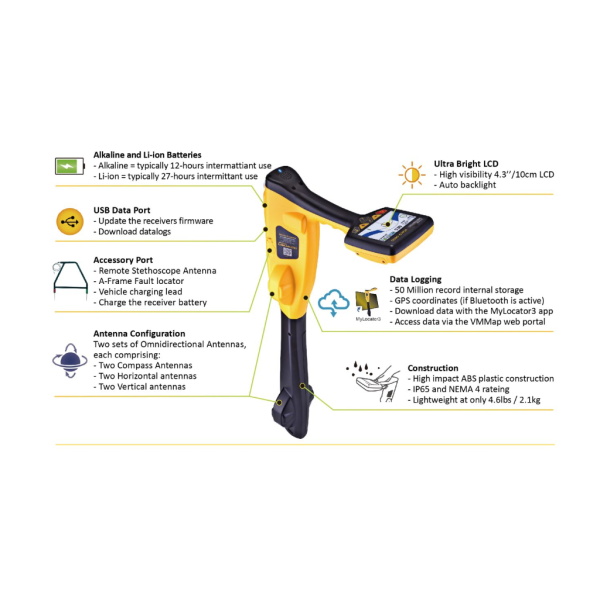 VLoc3-5000 Precision Utility Locator je plne vybavený Bluetooth, WiFi a integrovaným GPS.